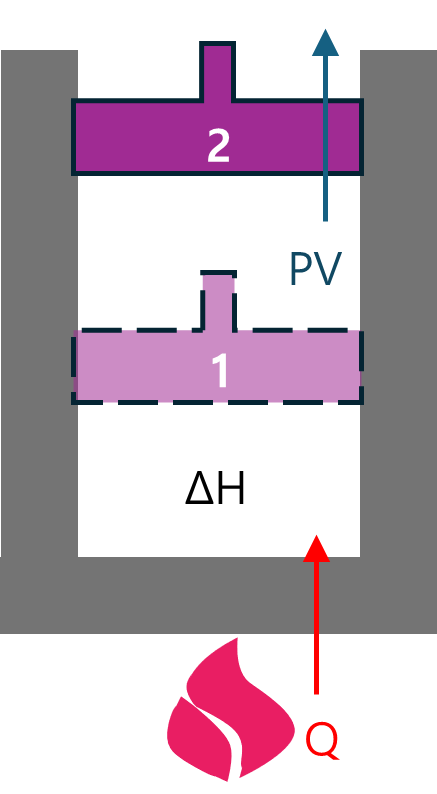 그림처럼 실린더에 열을 가해 피스톤이 1→2로 이동한 것을 열역학 제1법칙에 대입하면