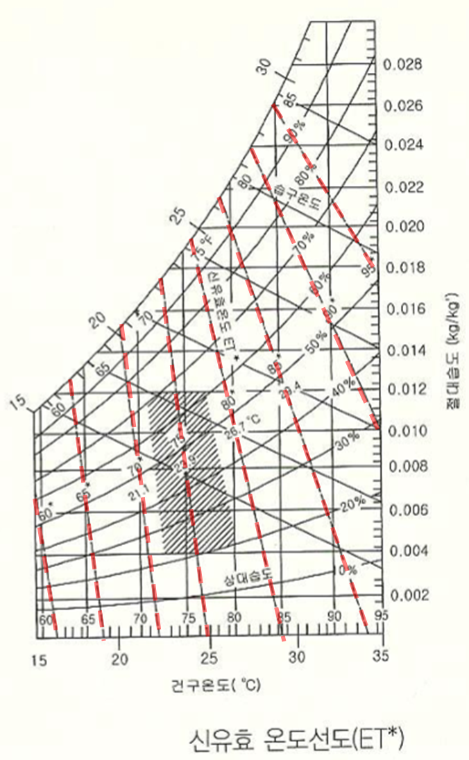 성인이 가벼운 옷을 입고 근육노동 없이 0.25m/s이하의 미풍이 있는 실내에서 장시간 머무를 때 느끼는 온감을 표시한 것이며, ASHRAE에서는 실내 권장 조건으로 빗금 친 부분을(22℃~26℃/ 절대습도 0.0042~0.012kg/kg) 권장하고 있습니다. 상대습도 50% 선을 따라 숫자위에 *표시가 되어있는 것이 ET* 입니다. 점선으로 표시된 것이 ET*선이며 선의 경사를 통해, 30℃ 이상에서 온감은 절대습도에 의해 좌우되며 25℃ 이하에서 온감은 공기온도의 영향을 받는 것을 알 수 있습니다.